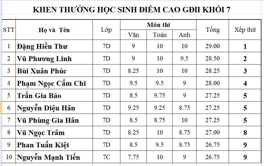 DANH SÁCH HỌC SINH ĐẠT ĐIỂM CAO TRONG KSCL HKI NĂM HỌC 2025-2026