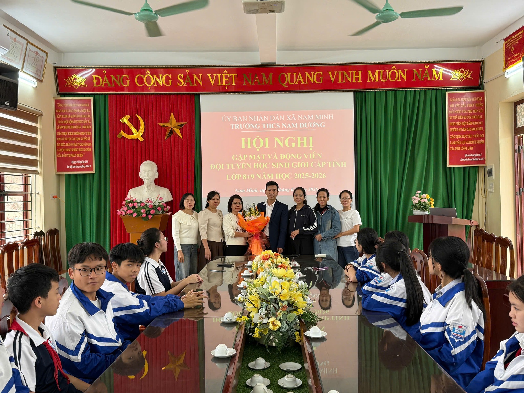 Tại buổi gặp mặt đồng chí: Hà Duy Tiên – Bí thư Đảng uỷ, Chủ tịch HĐND xã Nam Minh thay mặt Lãnh đạo địa phương đã tặng hoa, quà và phát biểu ghi nhận và biểu dương những kết quả mà thầy trò đã đạt được trong thời gian qua trong đó có công tác Bồi dưỡng các đội tuyển học sinh giỏi của nhà trường, đồng thời chúc các cháu Học sinh mạnh khoẻ và đạt kết quả cao trong kỳ thi học sinh giỏi cấp Tỉnh vào sáng ngày mai.