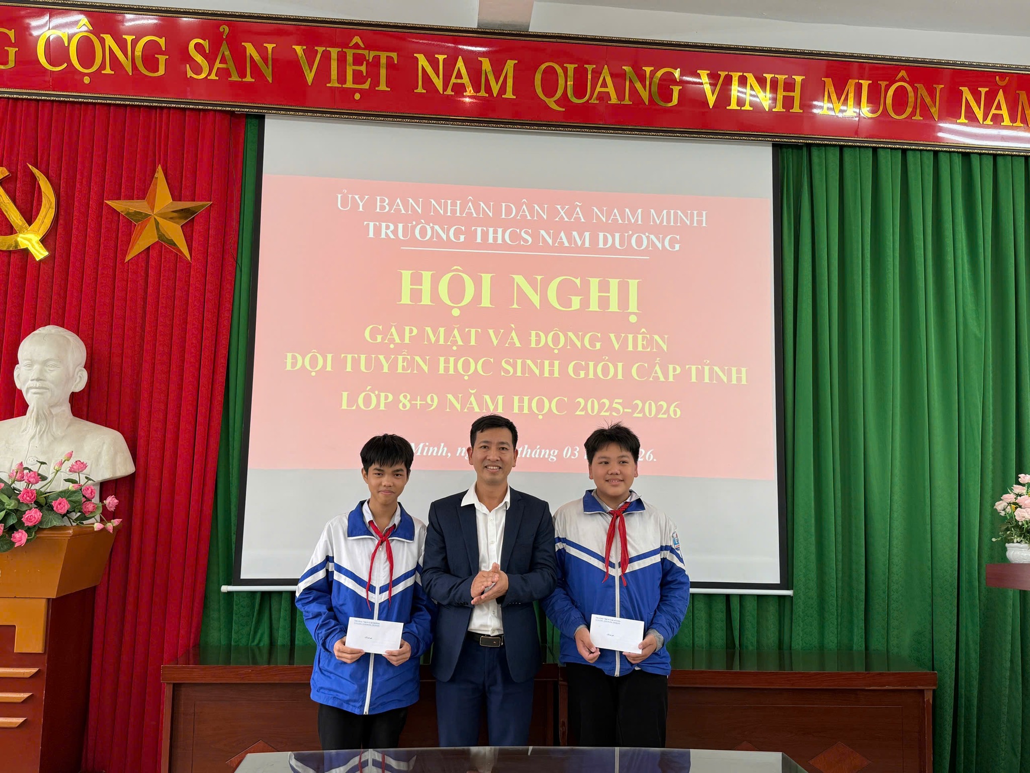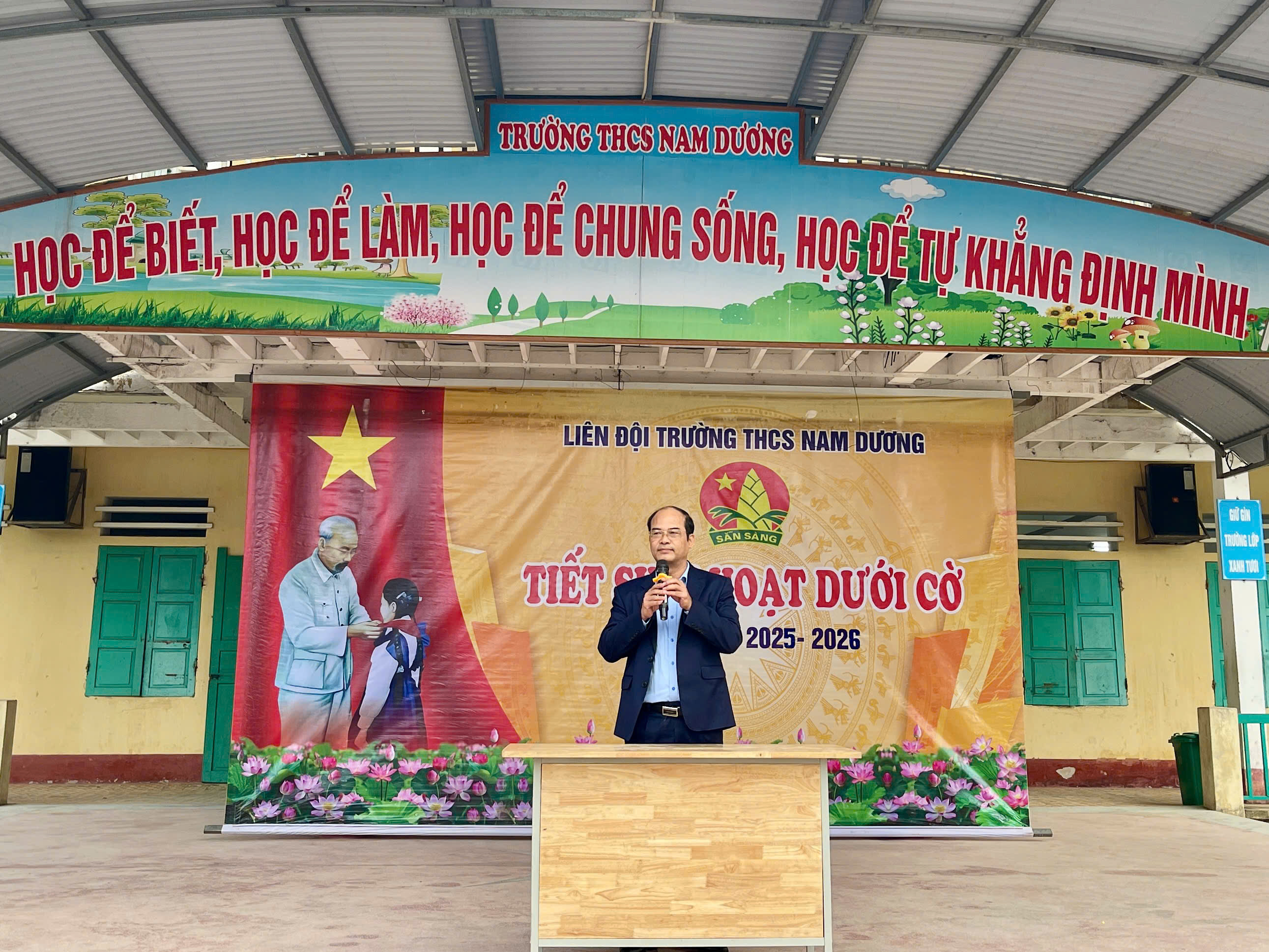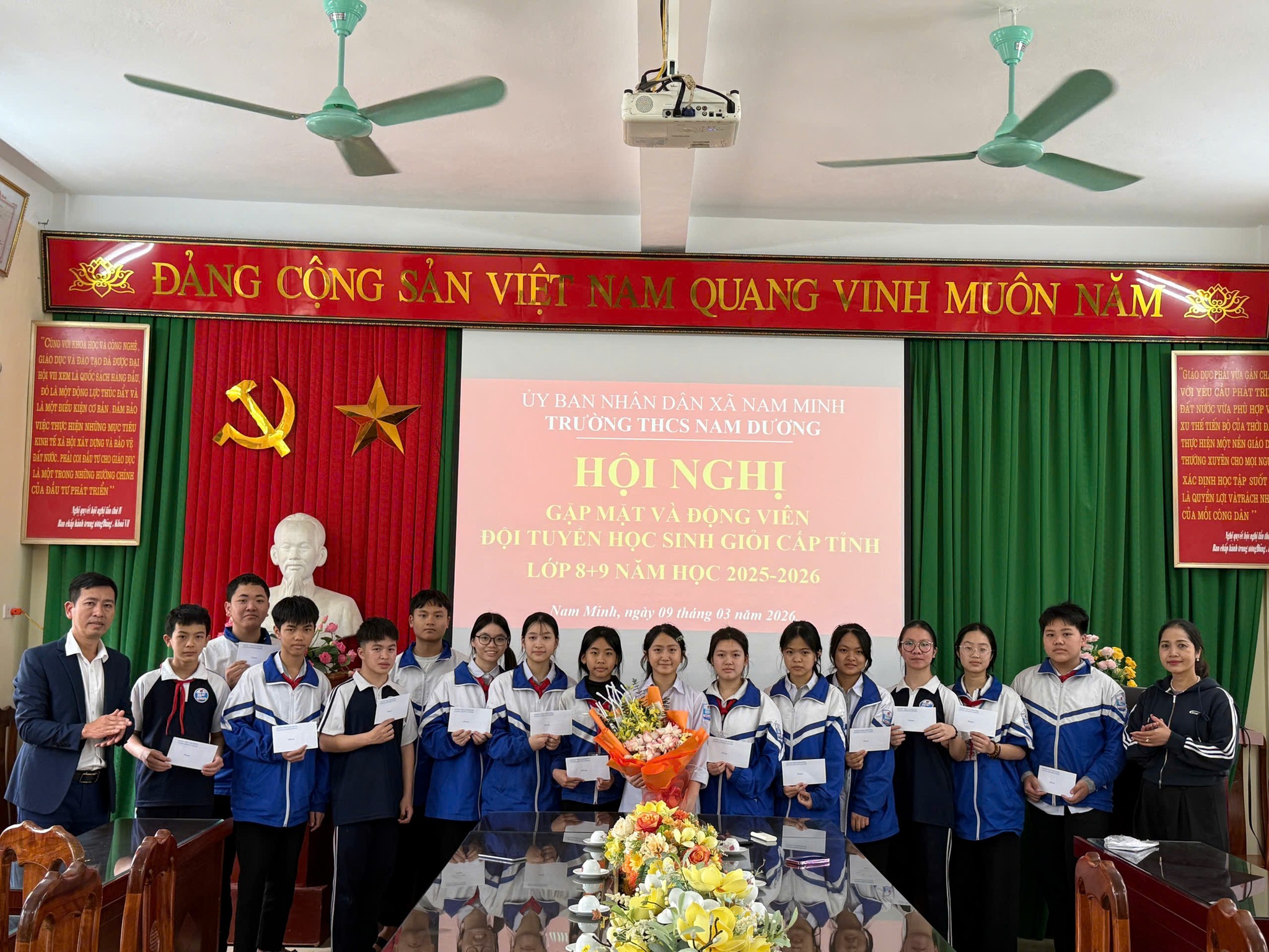Sáng nay thứ Hai, ngày 09/03/2026. Trong không khí trang nghiêm của buổi Lễ chào cờ đầu tuần, thầy và trò Trường THCS Nam Dương rất vinh dự được đón tiếp các đồng chí Lãnh đạo đại diện cho Đảng ủy, HĐND, UBND và các ban ngành đoàn thể của xã Nam Minh về dự, động viên các thầy cô giáo và các em học sinh tham dự kỳ thi học sinh giỏi cấp Tỉnh vào sáng mai thứ Ba, ngày 10/3/2026 tại địa điểm thi trường: THPT Lý Tự Trọng.
